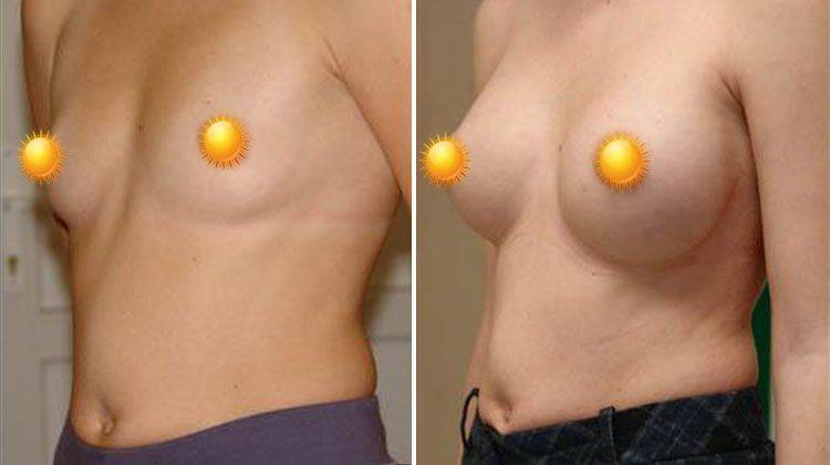 Фото до и после пластики груди из периареолярного доступа имплантатами объемом 390 мл