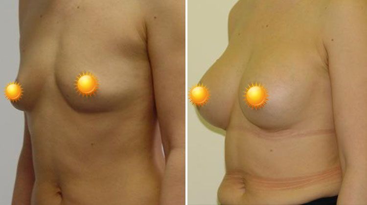 Фото до и после увеличения груди из субмаммарного доступа имплантатами объемом 310 мл