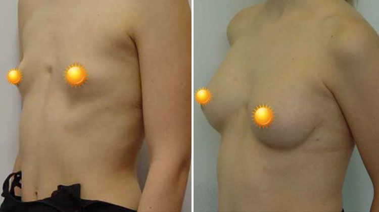 Фото до и после увеличения груди при аномалиях развития имплантатами объемом 195 мл