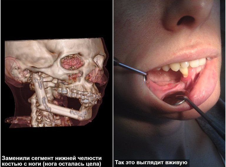 Результат и последующая динамика, после проведения операции по устранению опухоли нижней челюсти. Примечательно, что опухоль удаляется только с сегментом нижней челюсти, который заменяется малоберцовой костью с ноги с комплексом тканей. При этом ноги остаются целыми, пациент ходит без трости, может бегать. Также пациентке был установлен несъёмный зубной протез — полноценная замены "родным" зубам. Это и психотерапия для пациентки – она преобразилась и стала уверенней в себе. Дальнейшая динамика – показана на втором фото.