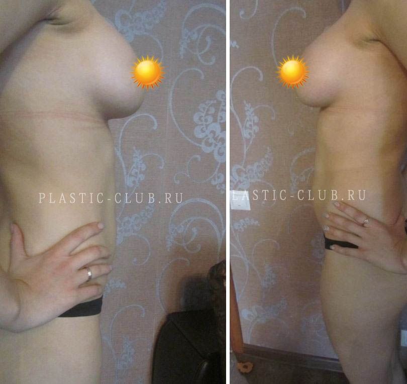 Фото до и после маммопластики с разрезом по ареоле имплантатами 370 мл