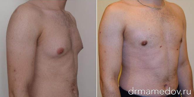 На первой фотографии представлено исходное состояние, врач установил гинекомастию. Для коррекции этой области была проведена липосакция и подкожная мастэктомия. Результат операции показан на следующих фото – дефект исчез, пока сохраняется отечность, видны места доступа.