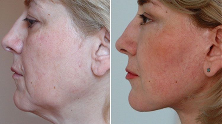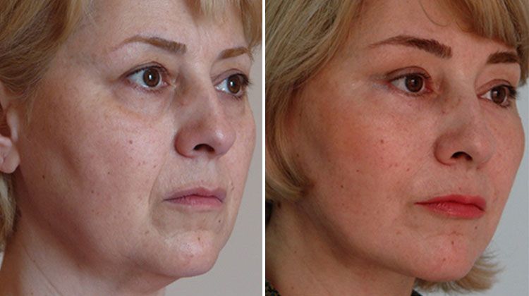 Пациентка 54 лет обратилась с желанием омолодить лицо и шею. Отмечаются выраженные возрастные изменения в области лица и шеи, отсутствие шейно-подбородочного угла, глубокие складки в приротовой области. Верхняя блефаропластика пациентке показана, но присутствует также уплощенность век и дряблость тканей. В области щек отмечаются скуловые мешки и глубокие V-образные борозды в области перехода щека-веко. Подобные западения в области перехода щека-веко невозможно полностью устранить за счет низведения собственных жировых грыж, а большое количество пересаженного жира (липофилинг) может привести в области нижних век к контурированию и комкованию его, поэтому решено было выполнить скелетное омоложение подглазничных краев (В 2010 году доктор Мамедов Эльчин впервые в России обосновал и доказал целесообразность проведения антивозрастных операций на лицевом скелете в сочетании с таковыми на мягких тканях).