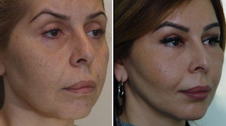 Пациентка 40 лет поступила в отделение с желанием устранить возрастные изменения в области лица. Ранее в другой клинике пациентке выполнили нижнюю блефаропластику с иссечением тканей, что позднее привело к выраженному западению тканей в подглазничной области и синдрому ‘’круглого глаза'. Также отмечается гипоплазия (недоразвитие) подбородка и птоз верхних век с западением тканей в этой области. Верхние веки при подобном птозе имеют высокую складку, которая смещена далеко под крышу орбиты и вместе с западением верхних век и контурированием костной орбиты (скелетизация) это придает человеку нездоровый вид. При этом веки опущены на зрачковую линию и наблюдается сужение поля зрения, а в сочетании с западениями в височных областях, возрастные изменения приводят к изможденному виду.