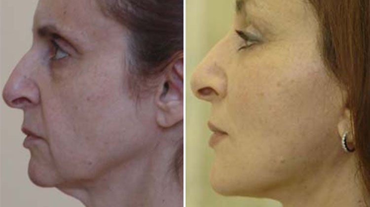 Анализ лица показал не только выраженные возрастные изменения в области лица и шеи, но и западение в области верхних и нижних век. Это придает глазам еще более “старческий” вид. При этом складка верхнего века смещается далеко под кость, со скелетизацией глазницы. Данное состояние в англоязычной литературе носит название “трупные глаза”. Наша концепция омоложения лица включает возвращение объемов, а не простое иссечение тканей. Было рекомендовано проведение объемной верхней и нижней блефаропластики с устранением слезной борозды, эндоскопической пластики лба, внутриротовой объемной эндопластики средней зоны лица, пластики SMAS, эндоскопически-вспомогательной пластики шеи и подтяжки зоны декольте.