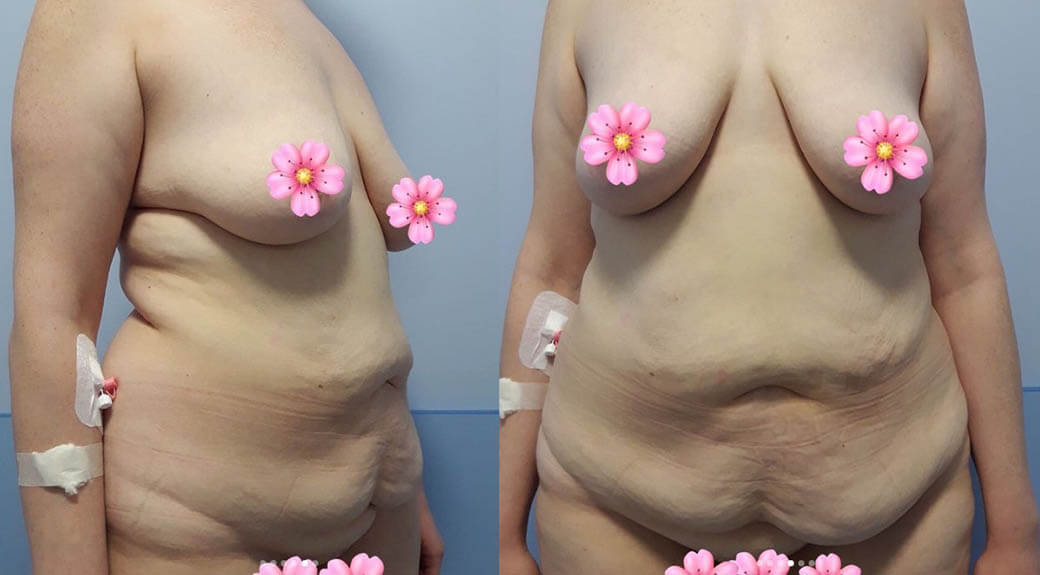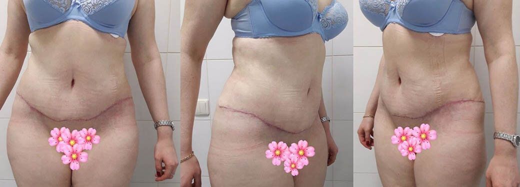 Ряд фотографий, снятых с различных ракурсов, показывает ситуацию с состоянием тела до и после проведения блока операций. Операции показаны пациентке, чтобы скорректировать тело после родов и сильного похудения. Ранний этап реабилитации: на фото видны довольно сильные отеки – это нормальный процесс. Были проведены: абдоминальная пластика живота, липосакция, ушивание диастаза, транслокация пупочного ложа. После ухода отеков будет видна стройная талия.