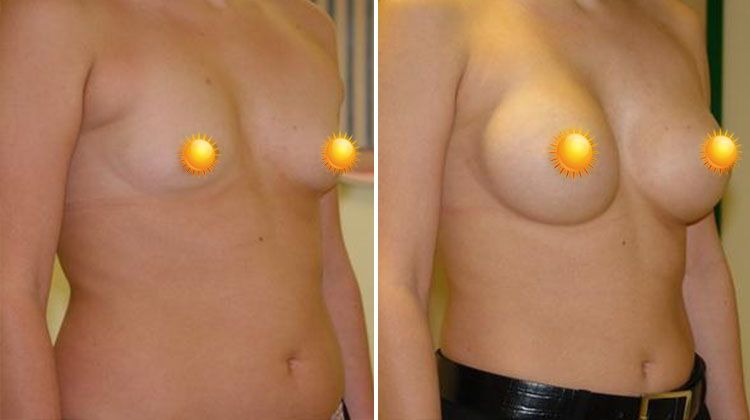 Фото до и после увеличения груди разрезом под мышкой имплантатами объемом 405 мл