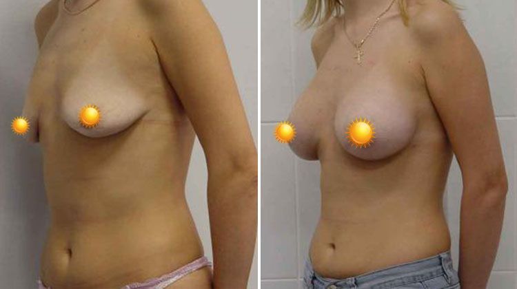 Фото до и после увеличения груди из периареолярного доступа круглыми имплантатами