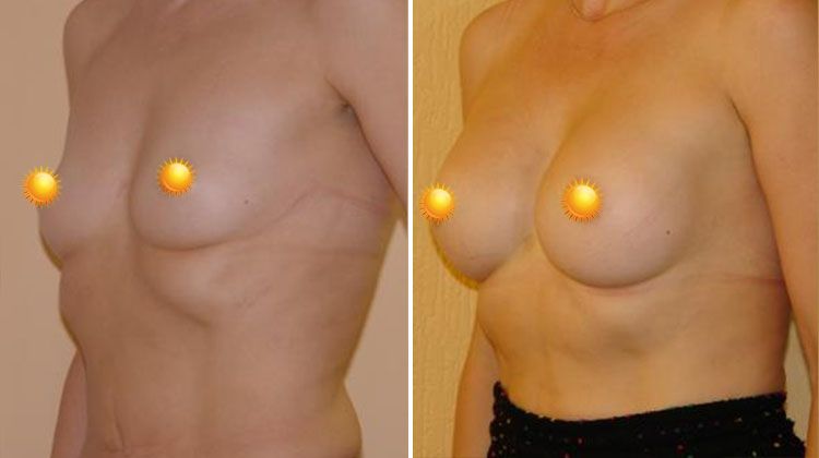 Фото до и после увеличения груди из периареолярного доступа имплантатами 395 мл