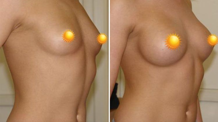 Фото до и после маммопластики из периареолярного доступа имплантатами круглой формы