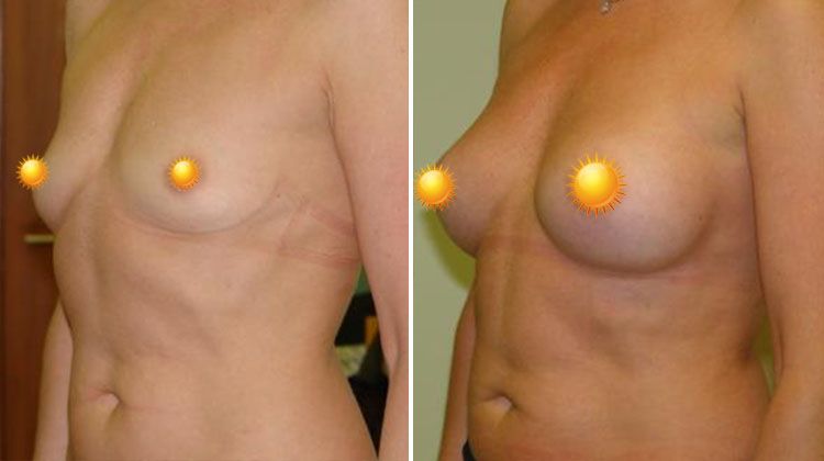 Фото до и после маммопластики из периареолярного доступа имплантатами объемом 320 мл