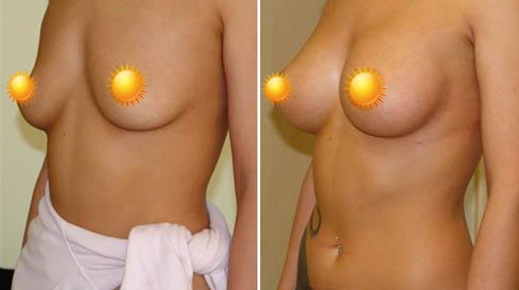 Фото до и после маммопластики с доступом из ареолы имплантатами объемом 320 мл