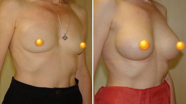 Фото до и после маммопластики из периареолярного доступа имплантатами объема 405 мл