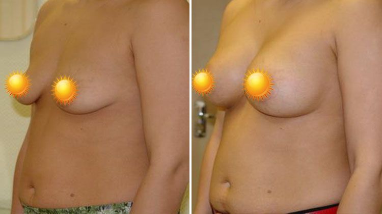 Фото до и после маммопластики имплантатами объемом 385 мл разрезом по ареоле